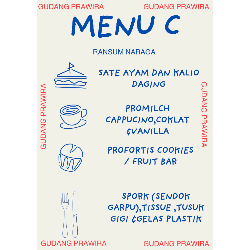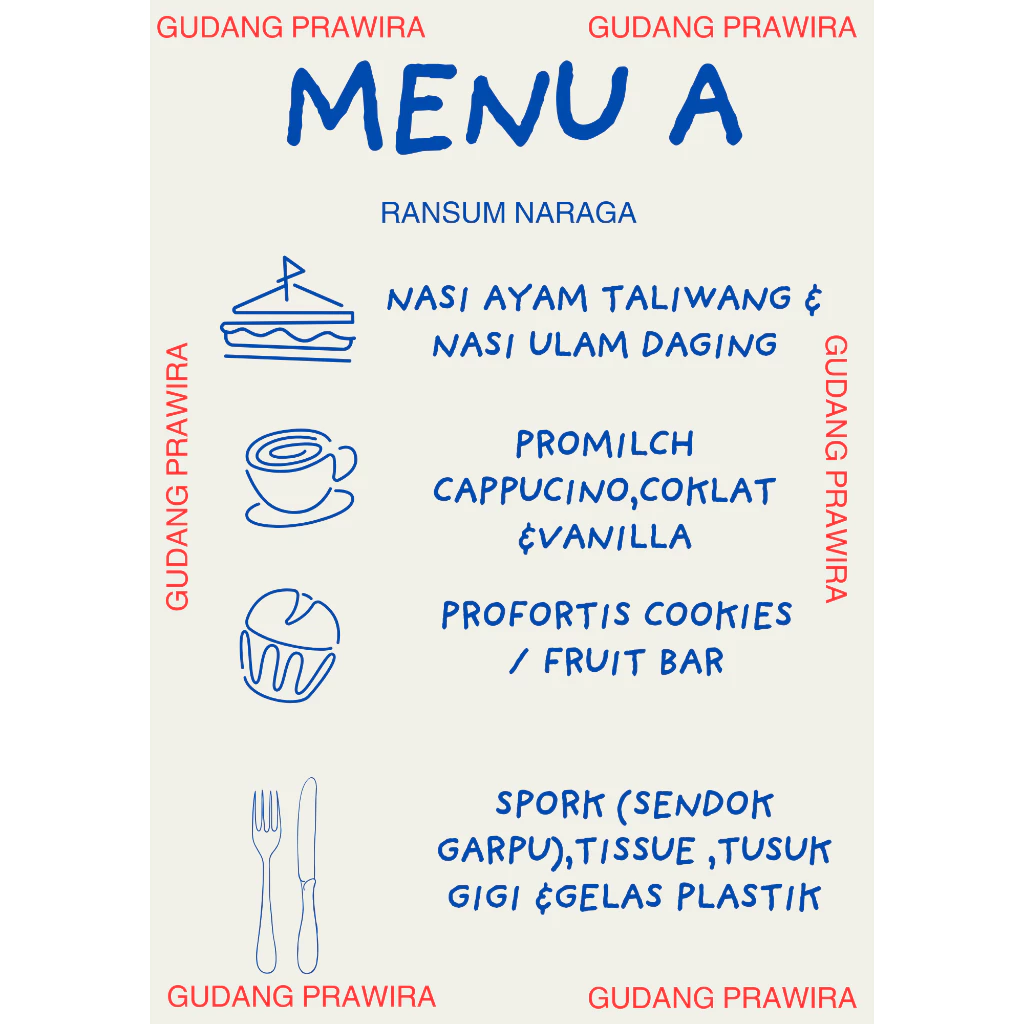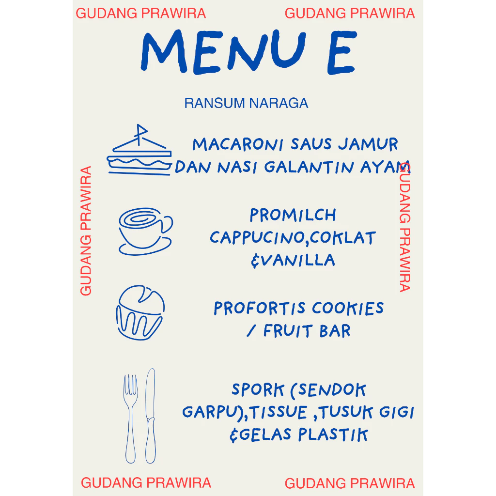 | MTP 1 | 1. Nasi Kuning Ayam, Nasi Daging Cabe Hijau, dan Nasi Ikan Masak Habang. 2. Suplus rasa strawberry dan jahe. 3. Triplus coklat. 4. Vitplus rasa Tutti Frutti. 5. E-plus rasa strawberry. 6. Kitplus rasa bawang. |
